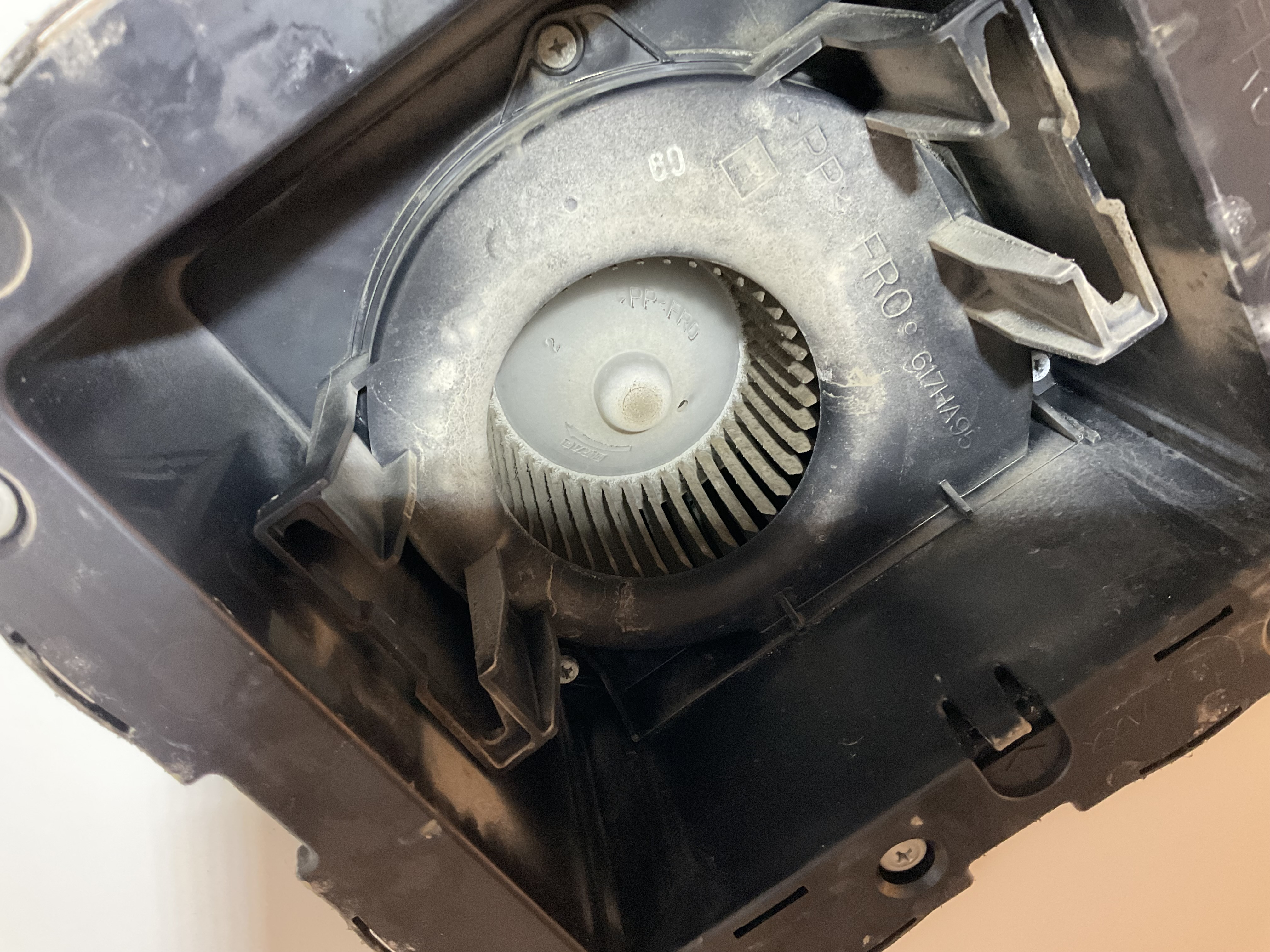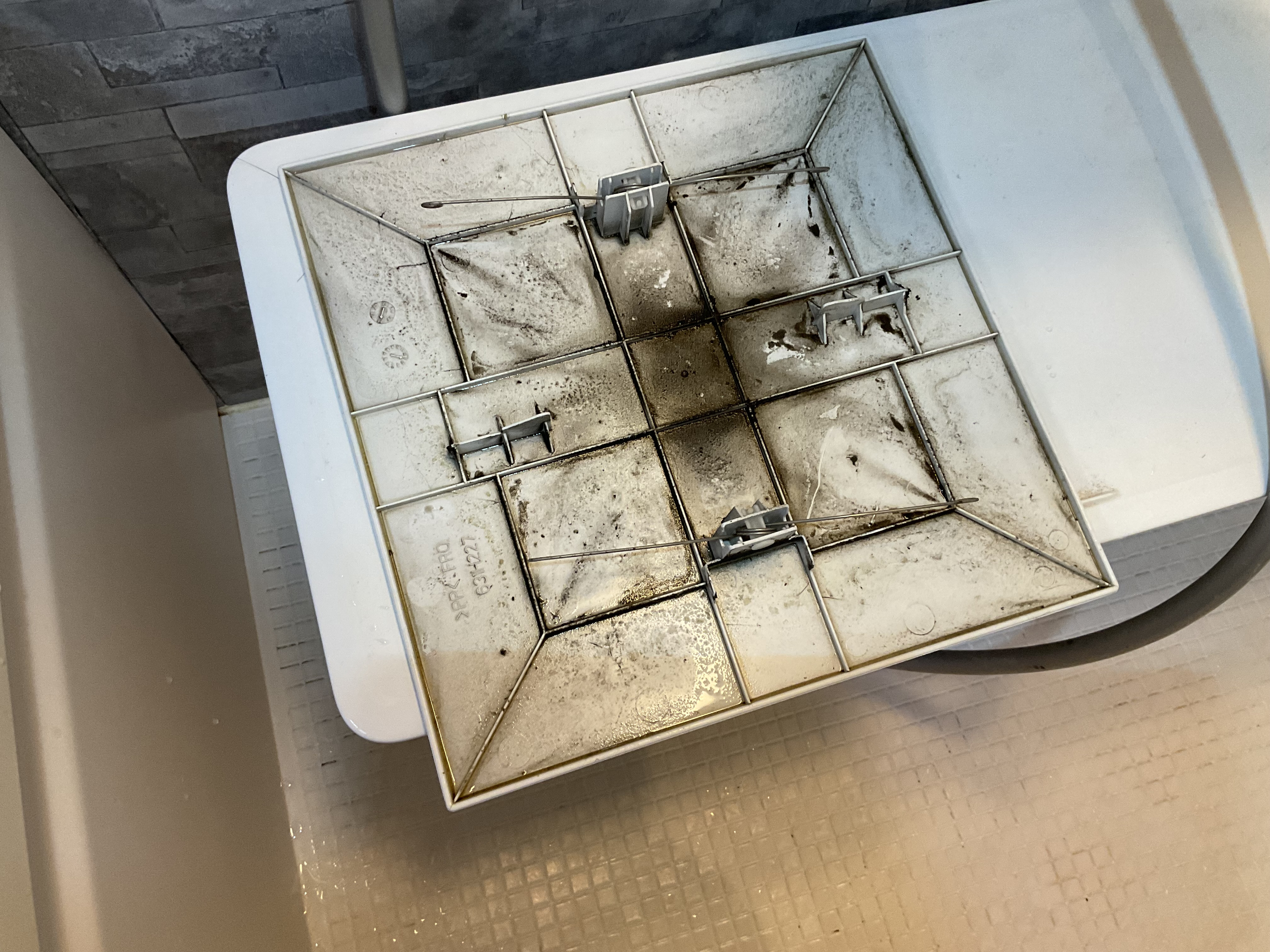 分解するとフィルター以外に熱交換器や送風ファンもハードに汚れていましたので洗剤と高圧洗浄で徹底的にクリーニングいたしました。